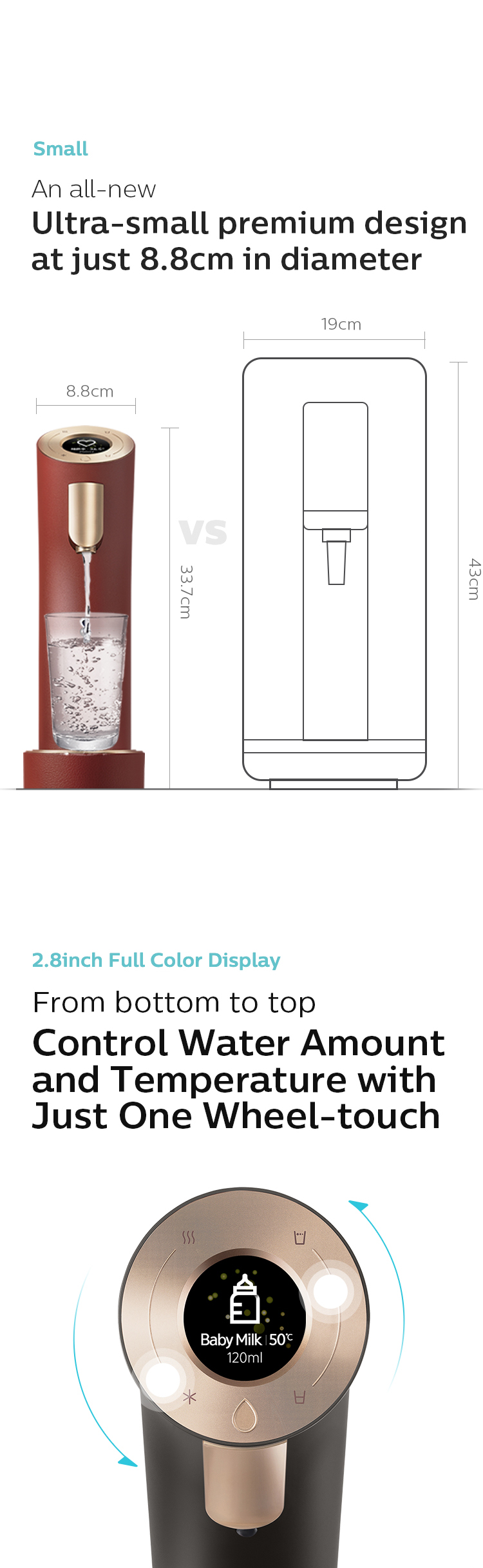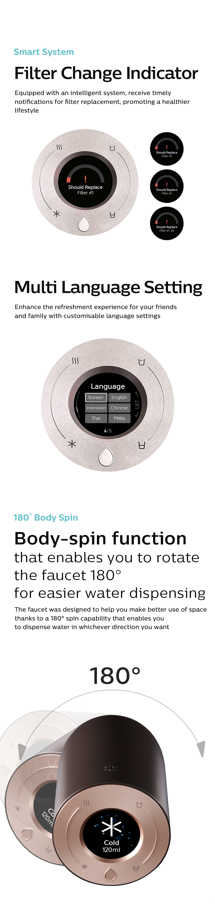 Auto antibacterial action / Auto drainage / Super bio water pipe / All-stainless-dual cooling water pipe |